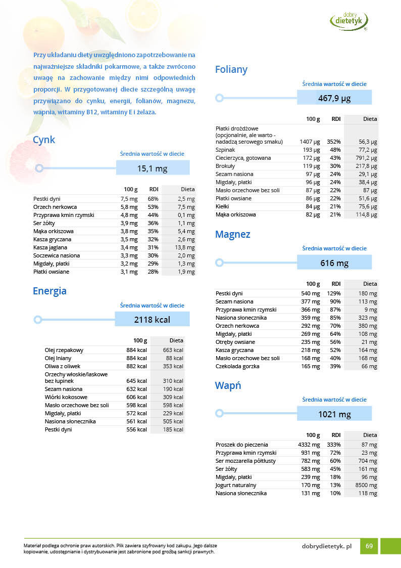 Program żywieniowy został skomponowany tak, aby zapewnić mamie i dziecku odpowiednią podaż energii oraz składników odżywczych niezbędnych przez cały DRUGI TRYMEST CIĄŻY. Wszystkie posiłki są zbilansowane w taki sposób, aby zapewnić optymalny przyrost masy ciała oraz zapobiec wystąpieniu anemii, cukrzycy ciążowej i nadciśnieniu tętniczemu. W diecie zwrócono szczególną uwagę na odpowiednią podaż białka oraz składników mineralnych, takich jak kwas foliowy, żelazo, wapń, magnez . Posiłki skomponowano w oparciu o niski ładunek glikemiczny.